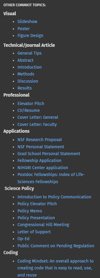 Re communication, when you're working in the weeds, it's easy make the assumption that others know what's old-hat knowledge to you, but they often don't. Often, when asking for money or presenting at a conference, a clear, simple narrative with more sparse visuals is far better and more effective than dense and detailed. Re communication, one of the best resources I've encountered is this MIT/Broad Research Communications Lab toolkit with specific advice for many different types of comms--presentations, papers, op-ed, congressional hill meetings (https://mitcommlab.mit.edu/broad/commkit/slideshow/; see topics covered in inline screenshot). I use it for pretty much every paper and presentation.