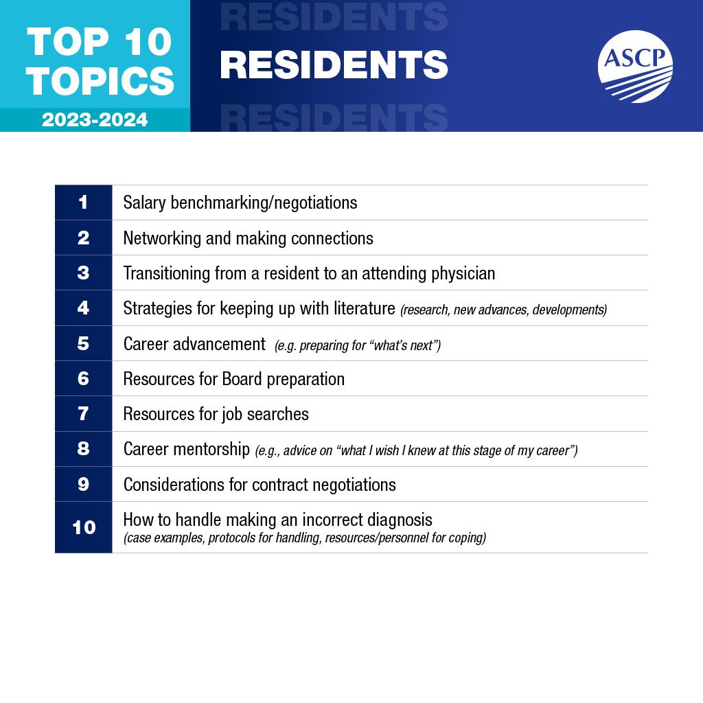 Brand new and updated for 2024-2025, I'm sharing the new Top 10 Hot Topics, as reported by ASCP resident members. Here in the Pathologists in Training Member Community, discuss these topics and any others on your mind related to your work. This list will be used throughout the year to address the topics keeping you awake at night. Thank you to all who participated!